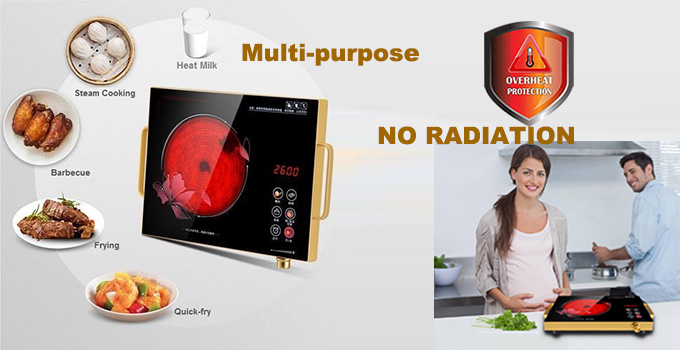 Its heating plate is composed of iron chromium heating plate and adiabatic plate of the heating part. And has the characteristics of gradual temperature rise, triple heat balance and no local high temperature, etc. It is not easy to paste the chassis, false boiling and so on. As like gas oven, it is a multi-purpose stove which can fry, barbecue, chafing dish, stir-fry, hot milk, soup, slow stew, etc. It can also be matched with grilling pans and grilling nets for barbecuing, and has no special requirements for the material of pots and pans, nor electromagnetic radiation hazards.